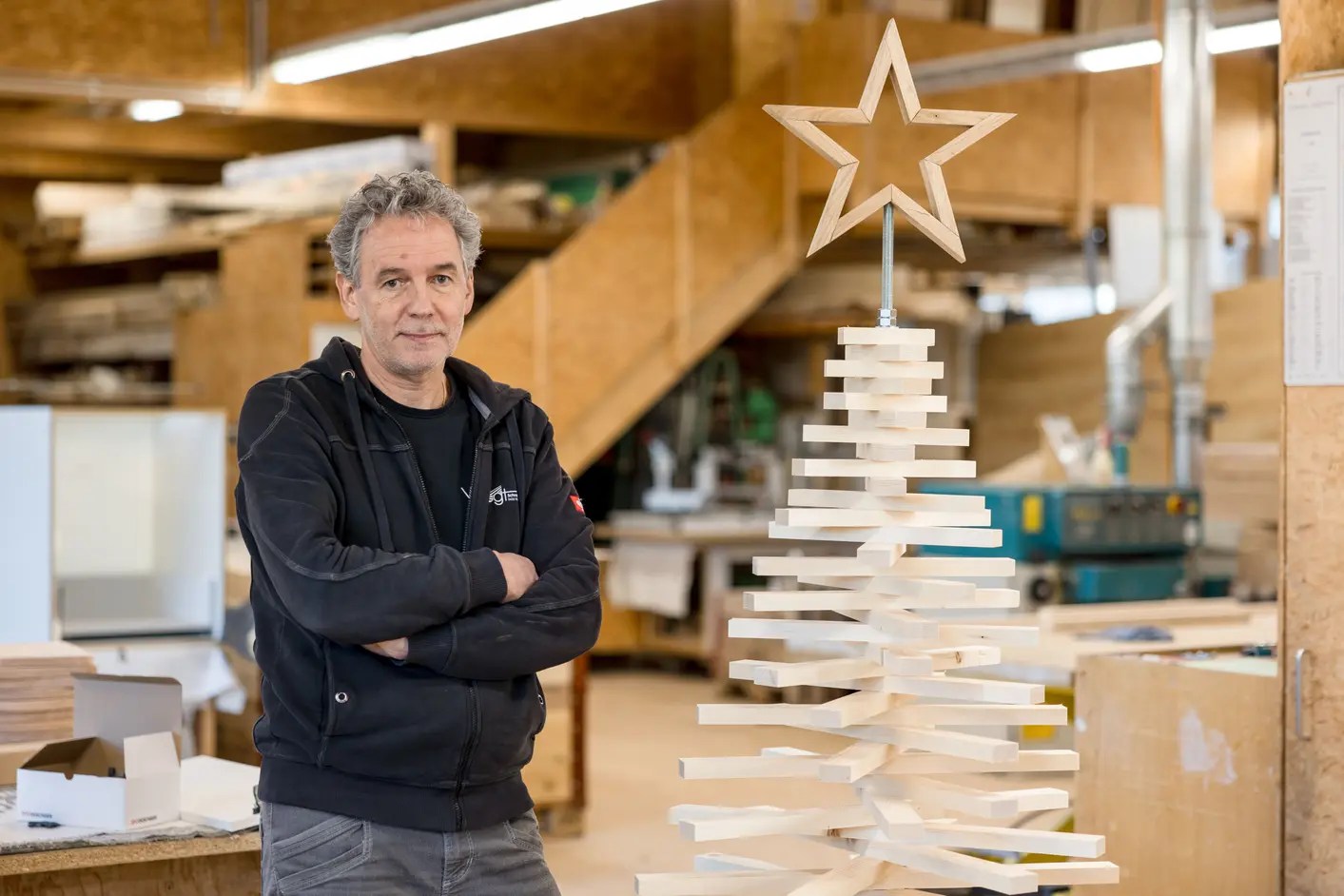In Markus Vogts Schreinerei entstehen Weihnachtsbäume aus Schweizer Fichtenholz. Wo der besondere Christbaum bereits steht und wie er hergestellt wird.